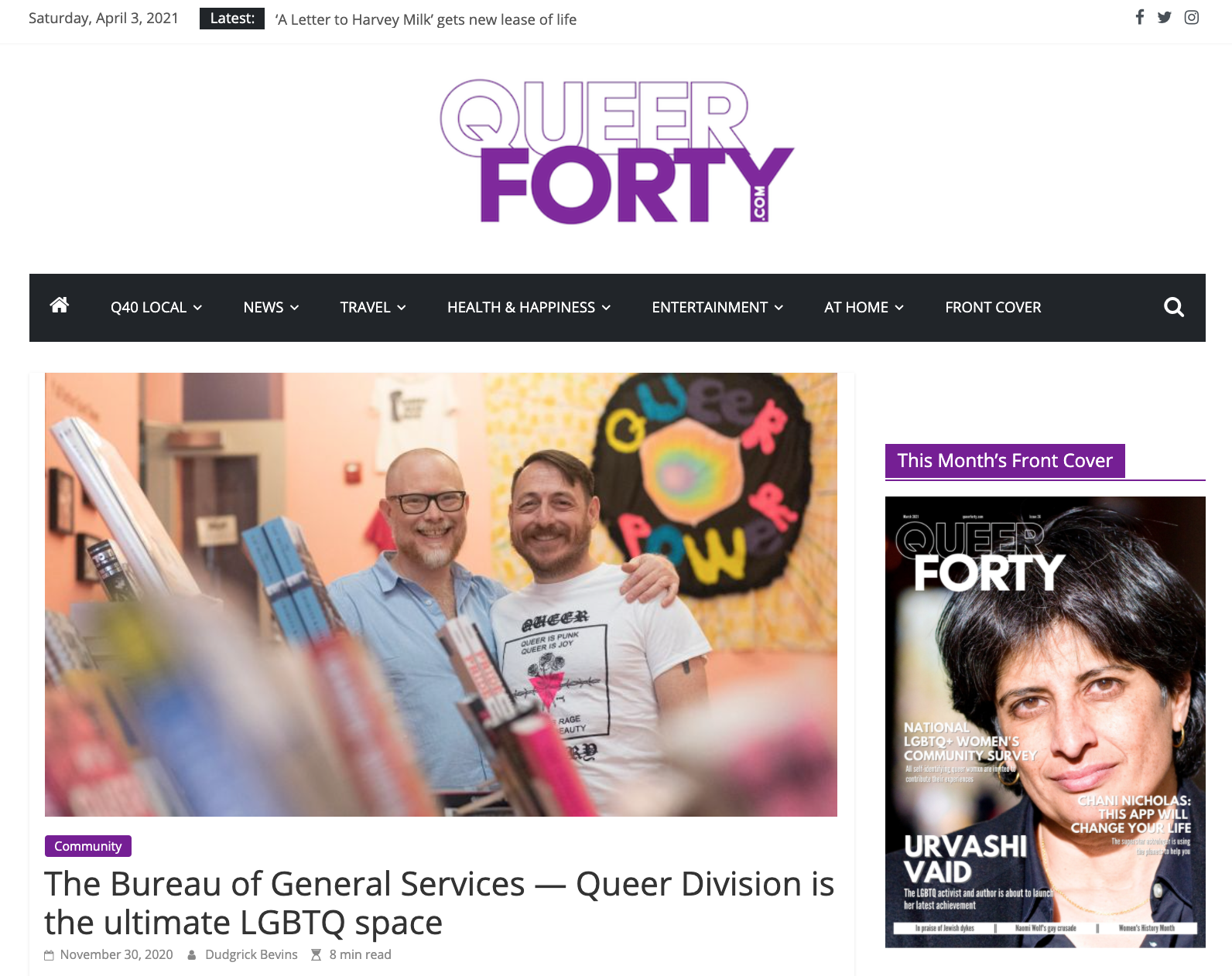 Dudgrick Bevins, founder of the annual NYC Queer Comic Fair that the Bureau has hosted since 2017, interviewed Bureau co-founders Greg Newton and Donnie Jochum for an article published on November 30, 2020, on QueerForty.com: “The Bureau of General Services — Queer Division is the ultimate LGBTQ space.” Thank you, Dudgrick!