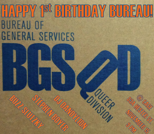 The Bureau of General Services—Queer Division is an independent, all-volunteer queer cultural center, bookstore, and event space that opened in New York City in 2012 and has been hosted by The Lesbian, Gay, Bisexual & Transgender Community Center since 2014. We aim to foster a community invested in the values of mindfulness, intellectual curiosity, justice, compassion, and playfulness. The Bureau seeks to excite and educate a self-confident, sex-positive, and supportive queer community by offering books, publications, and art and by hosting a wide variety of cultural events, including readings, performances, film screenings, book discussion groups, and workshops. We provide local and visiting queers and friends with an open and inclusive space for dialogue and socializing.