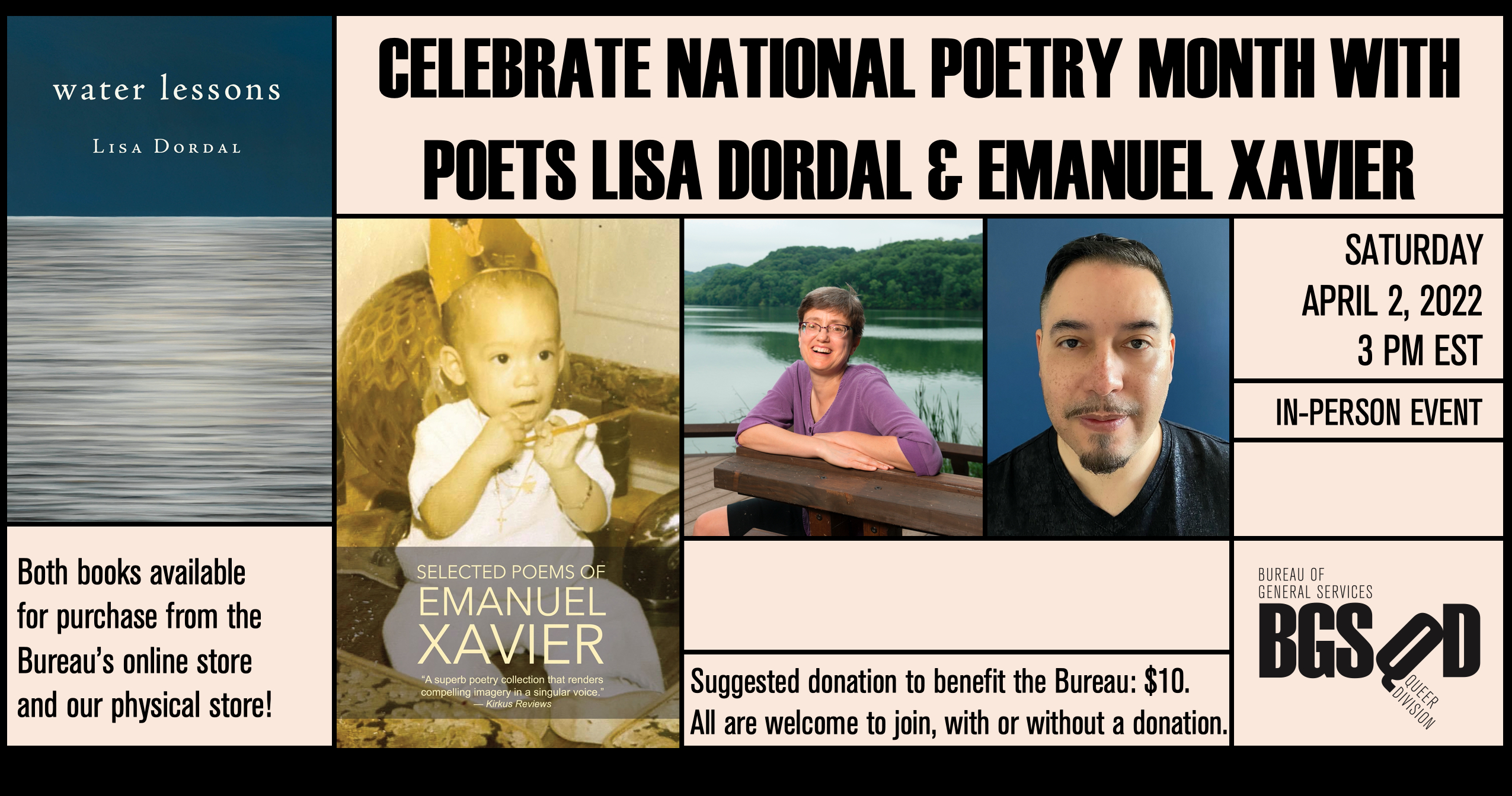 Kick off National Poetry Month at the Bureau of General Services—Queer Division as two award-winning queer poets, Lisa Dordal & Emanuel Xavier, share their poems of wisdom, struggle, and transformation.