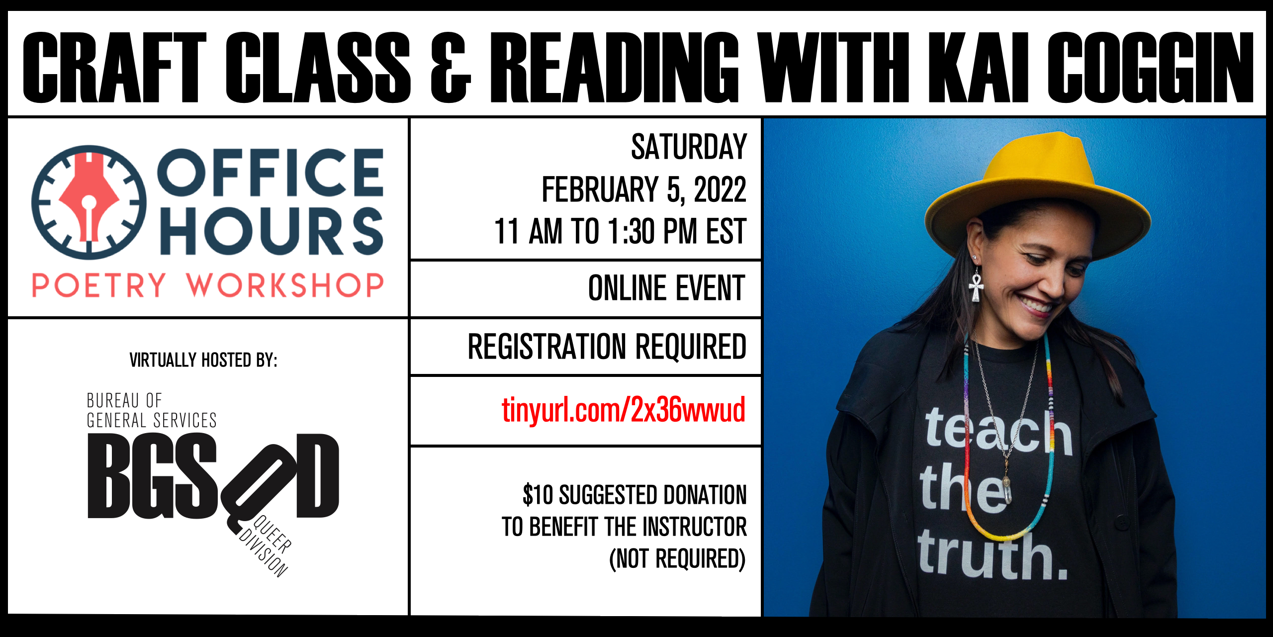 In this workshop, Office Hours writers will read a selection of poetry with examples of the Open Letter. We will discuss various aspects of form, craft, and attention to figurative language used by the different poets in the packet, and finish with time to write an open letter poem from a selection of prompts provided by Kai. There will be time for sharing at the end.