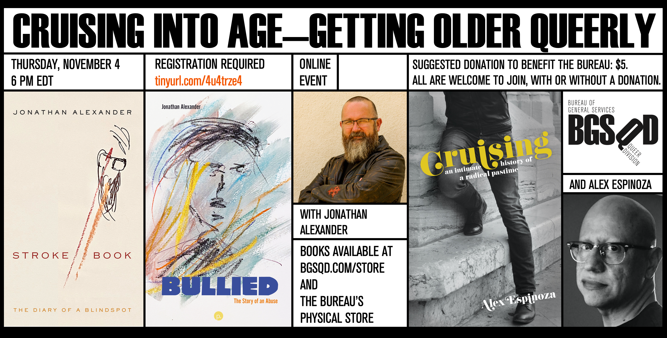 How do queers age gracefully — and queerly? How do they deal with traumatic pasts, which sometimes leave painful personal and physical legacies, and how do they do so while keeping desire and intimacy alive? Prolific queer author Jonathan Alexander discusses his two new Fall books, the critical memoirs Stroke Book: The Diary of a Blindspot (Fordham University Press) and Bullied: The Story of an Abuse (Punctum) with fellow queer writer Alex Espinoza, author of Cruising: An Intimate History of a Radical Pastime.