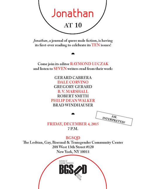 Jonathan, a journal of queer male fiction, is having its first-ever reading to celebrate its TEN issues! Come join its editor RAYMOND LUCZAK and listen to SEVEN writers read from their work: