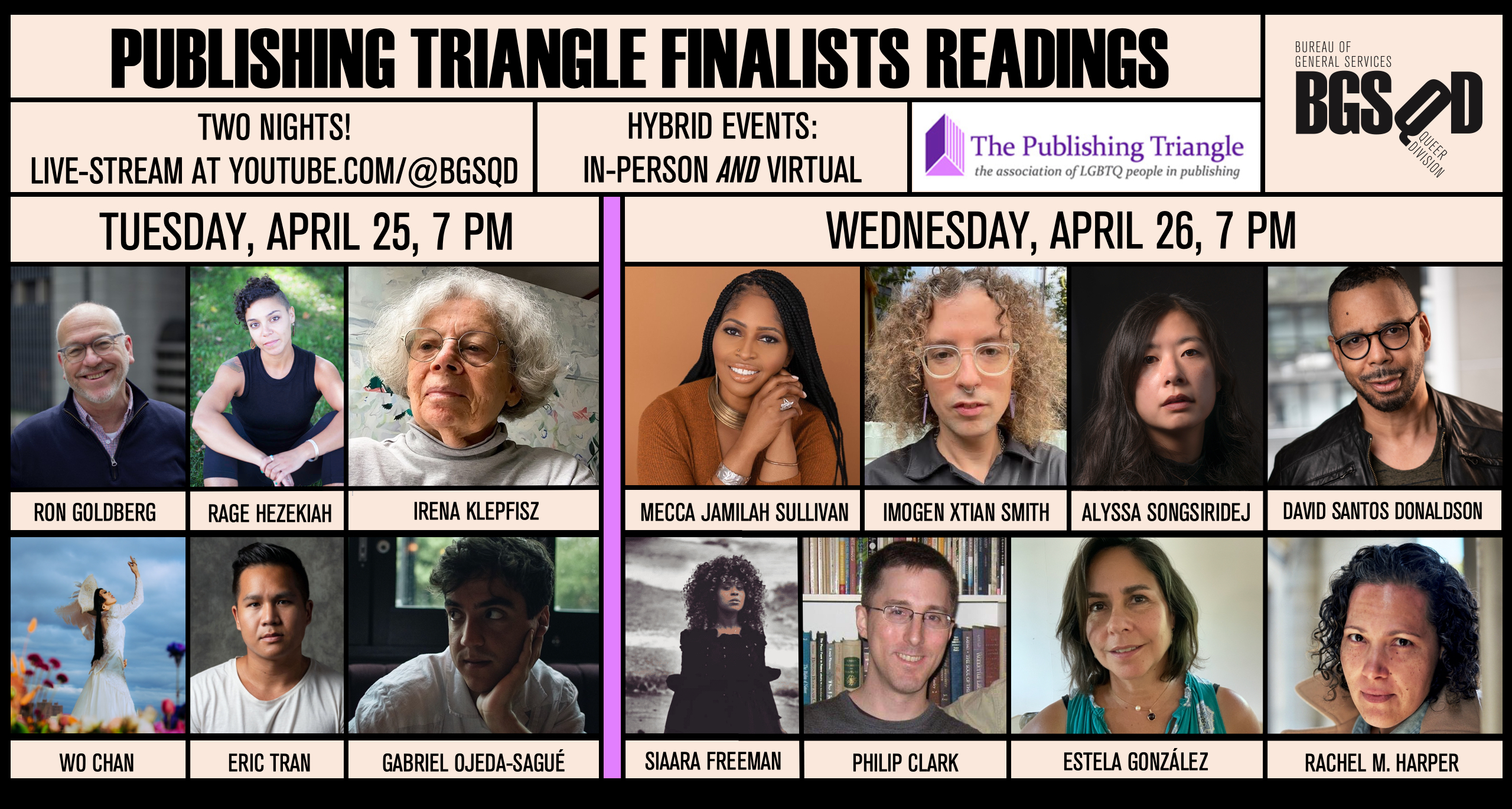 Join us for two night’s of hybrid in-person & virtual readings by finalists for Publishing Triangle Awards at the Bureau! Both readings will also stream on the Bureau’s YouTube channel: youtube.com/@bgsqd