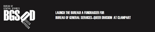ClampArt is proud to host Launch the Bureau! A Fundraiser for the Bureau of General Services—Queer Division. A silent auction of gifts from artists and authors will take place from 7 to 8:30. Readings by Pamela Sneed and Laurie Weeks. At present, the list of contributing artists and authors includes the following. Click on links to see images and information on our Tumblr page.